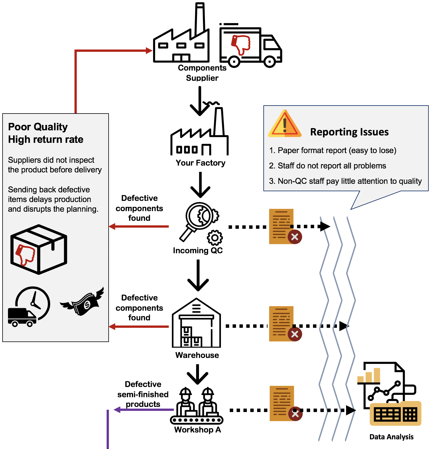- Inconsistent product quality from suppliers, which causes delays and other production issues